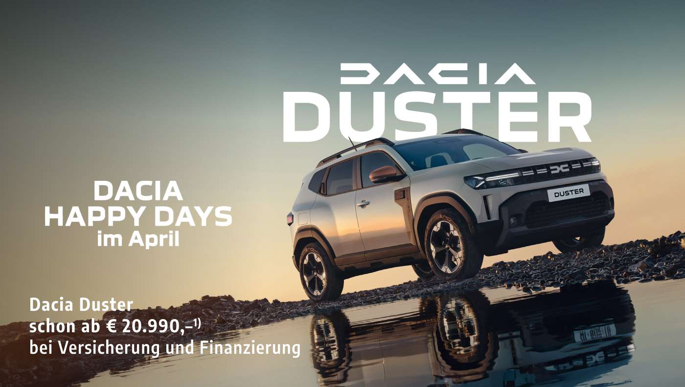 1) Unverb. Kaufpreis inkl. USt, NoVA und Boni iHv. € 500,- gültig für Privatkunden bei Kaufvertragsabschluss bis 30.04.2026 zzgl. maximal € 300,- (exkl. NoVA) Auslieferpauschale. Kaufpreis beinhaltet einen Versicherungsbonus von Mobilize Financial Services (eine Marke für RCI Banque SA Niederlassung Österreich) iHv. € 500,-. Keine Barablöse möglich. Gültig nur in Kombination mit einem im Aktionszeitraum eingereichten und bei Auslieferung des ausgelobten Fahrzeugs abgeschlossenen Finanzierungs- und Versicherungsvertrages bei Mobilize Financial Services mit folgenden Konditionen: Abschluss von Vollkasko- und Haftpflichtversicherung über carplus (Wr. Städtische) mit Mindestlaufzeit 36 Monate. Es gelten die Annahmerichtlinien der Versicherung. Änderungen, Satz- und Druckfehler vorbehalten. Symbolfoto. Gesamtverbrauch Dacia Duster von 6,1–4,6 l/100 km, CO2-Emission 139–105 g/km, homologiert gemäß WLTP.