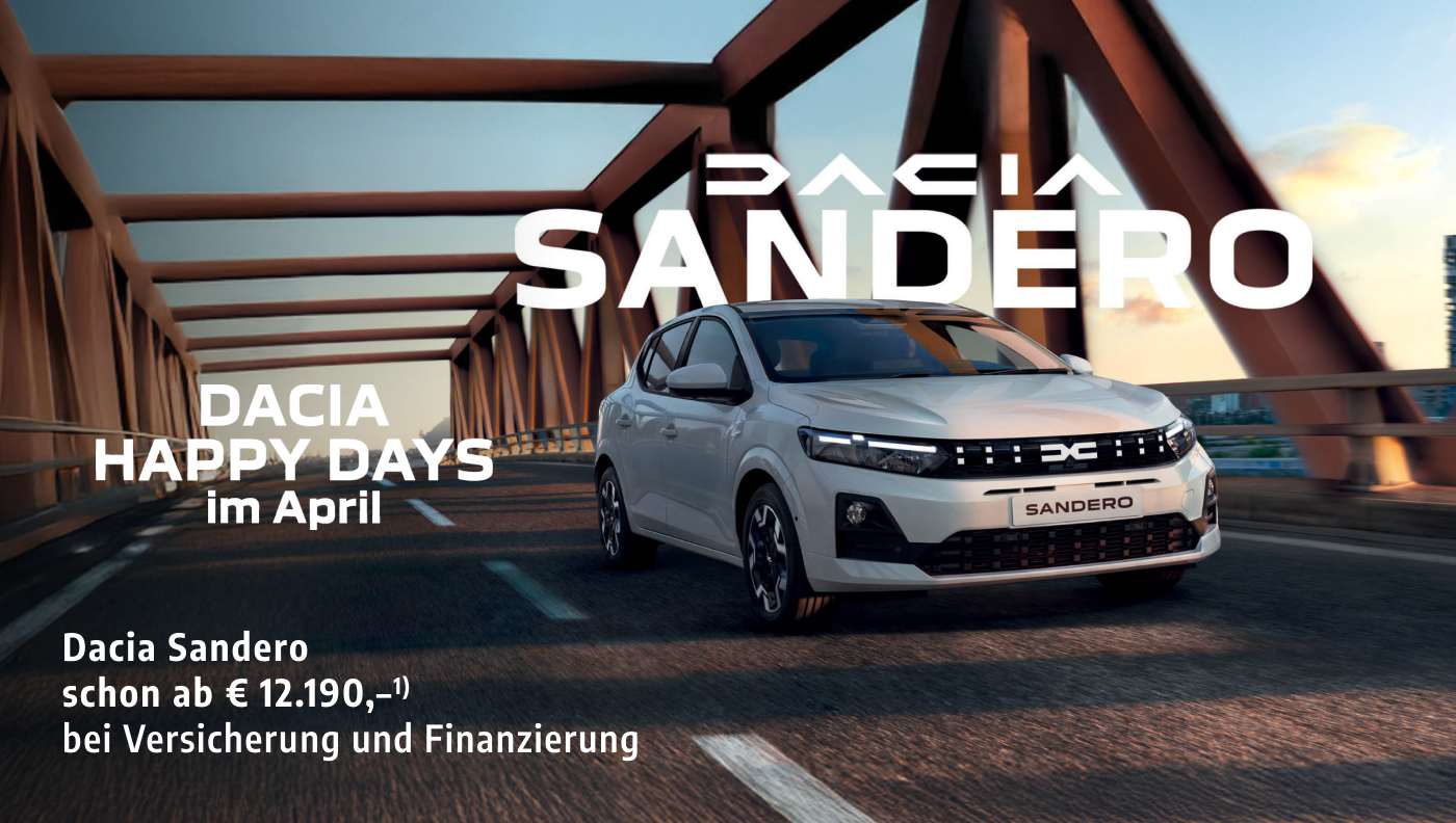 1) Unverb. Kaufpreis inkl. USt, NoVA und Boni iHv. € 500,- gültig für Privatkunden bei Kaufvertragsabschluss bis 30.04.2026 zzgl. maximal € 300,- (exkl. NoVA) Auslieferpauschale. Kaufpreis beinhaltet einen Versicherungsbonus von Mobilize Financial Services (eine Marke für RCI Banque SA Niederlassung Österreich) iHv. € 500,-. Keine Barablöse möglich. Gültig nur in Kombination mit einem im Aktionszeitraum eingereichten und bei Auslieferung des ausgelobten Fahrzeugs abgeschlossenen Finanzierungs- und Versicherungsvertrages bei Mobilize Financial Services mit folgenden Konditionen: Abschluss von Vollkasko- und Haftpflichtversicherung über carplus (Wr. Städtische) mit Mindestlaufzeit 36 Monate. Es gelten die Annahmerichtlinien der Versicherung. Änderungen, Satz- und Druckfehler vorbehalten. Symbolfoto. Gesamtverbrauch Dacia Sandero von 5,5–5,2 l/100 km, CO2-Emission 130–121 g/km, homologiert gemäß WLTP.